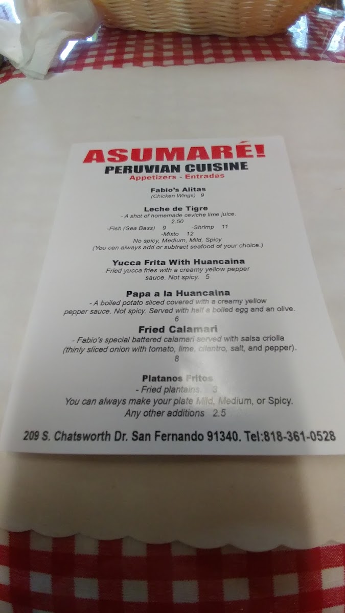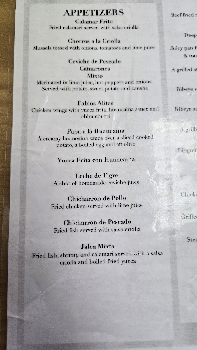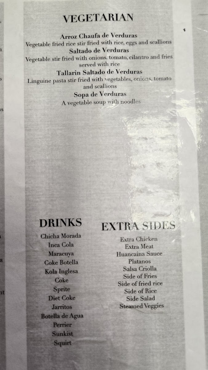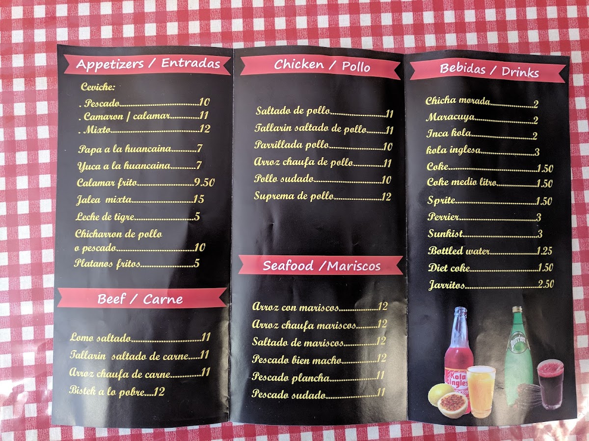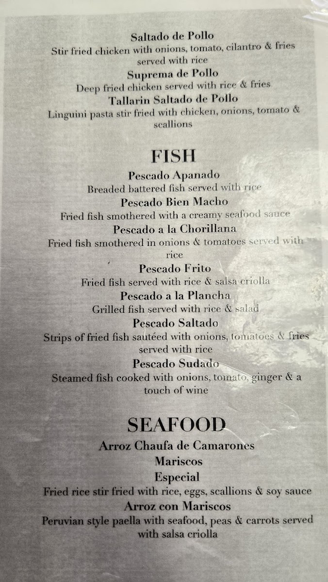 Located in San Fernando, this Peruvian restaurant offers a diverse menu featuring traditional dishes from Peru. The menu is organized into main categories including Beef, Chicken, and Seafood, providing a range of options for casual dining or takeout.